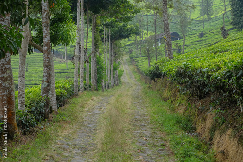 View of a rocky road in a tea plantation. Natural panorama of a tea plantation. You can see the tea harvest shelter hut