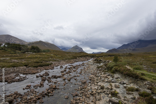 atmospheric, cloudscape, cloudy, countryside, daylight, grass, surface level, hill, hillside, horizon, landscape, moor, moorland, mountain chain, mountain, natural beauty, natural light, nature, open space, outdoors, panorama, perspective, river, riverbed, rock formation, rocky, rural, scenery, scenic view, scotland, shrub, sky, stone, stream, terrain, travel, tree, britain, vale, vegetation, view, vista, water, weather