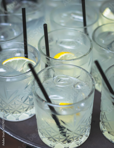 View of alcohol setting on catering banquet table, row line of alcohol cocktails with ice and lemon on a party, gin tonic, martini, vodka, and others on decorated catering banquet table event