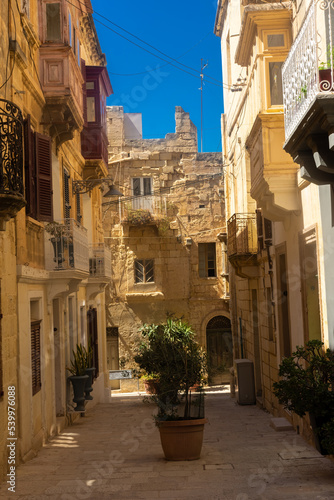 View of an ancient street in Birgu old town, one of the Three Cities of Malta