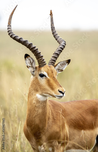 View of an impala with majestic spiraled horns standing alert in the golden savanna grass, a portrait of African wildlife, Nairobi, Nairobi County, Kenya.