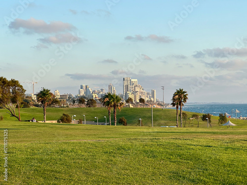 view, park, hill, city, city landscape, sky, cloud, grass, mediterranean, travel, tour tourism, israel, building, architecture, landmark, town, exterior, water, sea, embankment, nature, palm, tree
