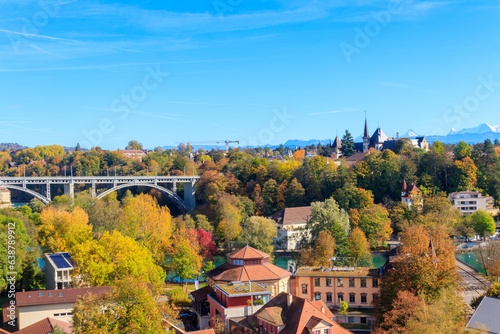 View of Bern city and the Bern History Museum at autumn with the Swiss Alps in the background