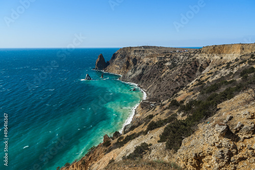 View of Cape Fiolent from the top of the cliff in spring. Sevastopol, Crimea