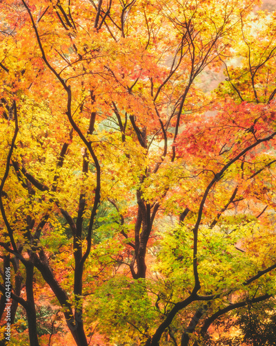 View of colorful autumnal trees in Kameyama Park, Kyoto, Japan.