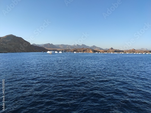 View of endless mountains and yachts in the Red sea