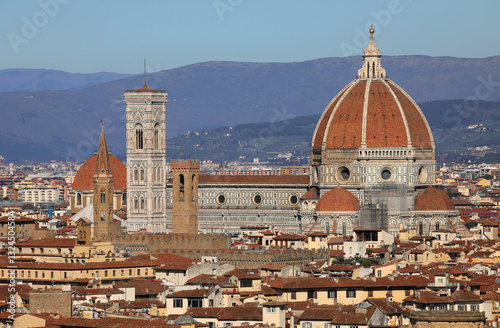 view of florence cathedral with the tall bell tower by artist giotto and the grand dome by architect brunelleschi with the tuscan hills in the background