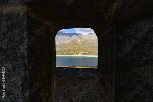 View of Fort Variselle at Lake Montcenis (Moncenisio) on the border between Italy and France. Old ancient historical fort ruins in stone in the Alps mountains
