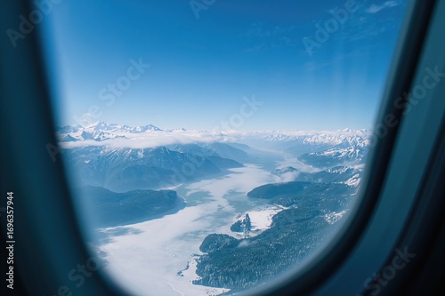 View of mountain range from airplane window