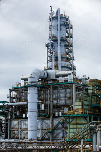 View of oil and gas refinery plant in Yaroslavl region. Petrochemical and chemical distillation process constructions and production communications. Gasoline, petroleum, petrol production