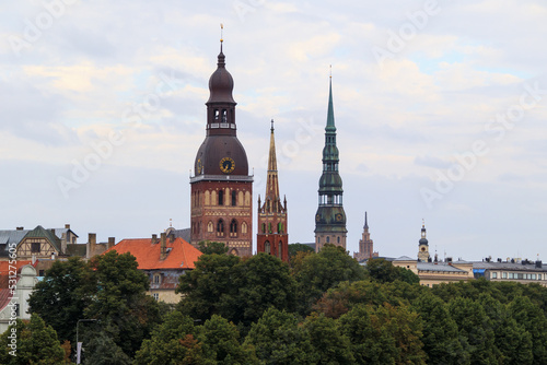 View of Old Riga with 3 church towers. Dom, Anglican and St. Peter's Church can be seen