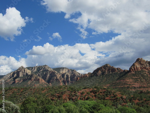 View of red rock mountains near Sedona, Arizona with clouds and blue sky in the background
