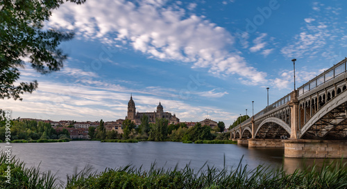 View of Salamanca (Spain) at sunset, with the cathedral and the Enrique Estevan bridge from the viewpoint of the pier on the Tormes river