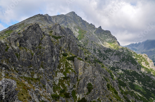 View of sharp green mountain and rock landscape with low clouds over the peaks in High Tatras, Slovakia