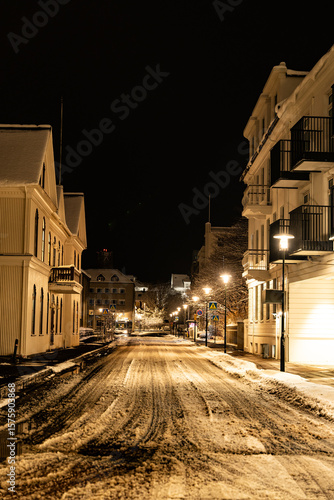 architecture, building, city, city landscape, cold, dark, exterior, iceland, illuminated, night, night time, perspective, residential, road, snow, snow-covered, snowfall, street, street light, town, travel, city landscape, urban scene, view, winter