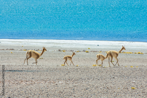 View of some vicuñas close to Miscanti Lagoon (Laguna Miscanti) at the Atacama Desert - Atacama, Chile