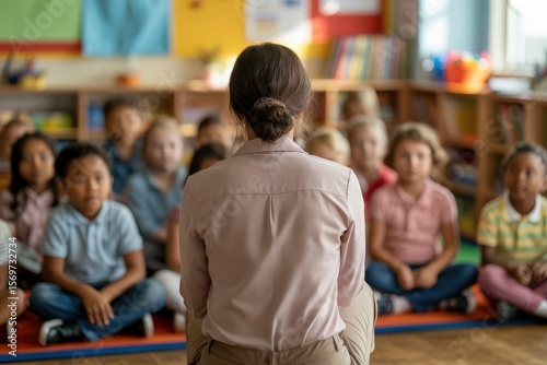 classroom, teacher, student, children, education, learning, school, elementary school, youth, group, indoor, bookshelf, book, colourful, rug, sitting, backview, hair, bun, shirt, desk, poster, window, daytime, sharpened, lesson, children, pupil