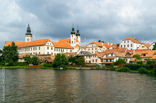View of Telc city Panorama with cloudy sky seen from the surrounding river. The historic center of Telc in southern Moravia, Czech Republic, is a UNESCO World Heritage Site.