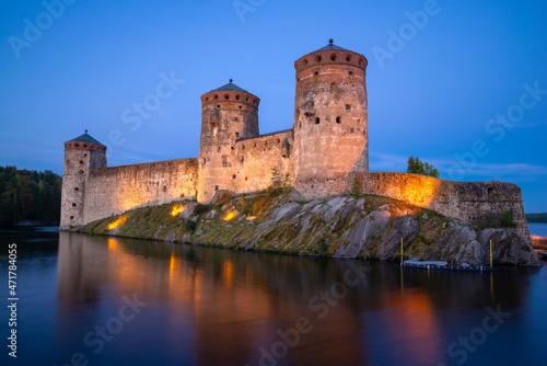 View of the ancient fortress of Olavinlinna, July night. Savonlinna, Finland, illumination, lights