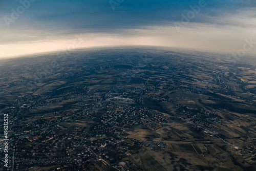 View of the city and mountains from above from a drone and an airplane. Cities aerial view, sky and clouds