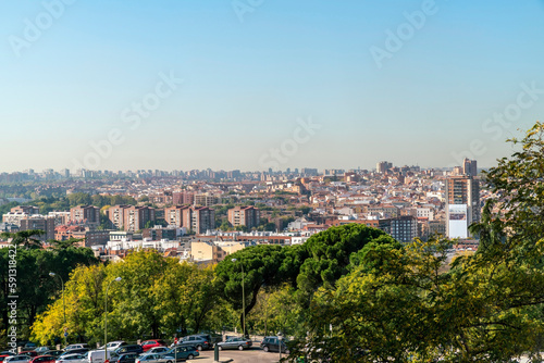 view of the cityscape of Madrid from the royal palace lookout plaza de la armeria, Madrid, Spain