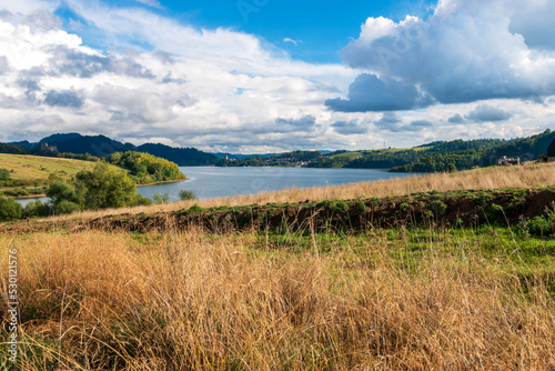 View of the Czorsztyn Lake. Castle in Niedzica and Czorsztyn in the background. Beautiful mountain landscape. Lagoon of the Pieniny Landscape Park