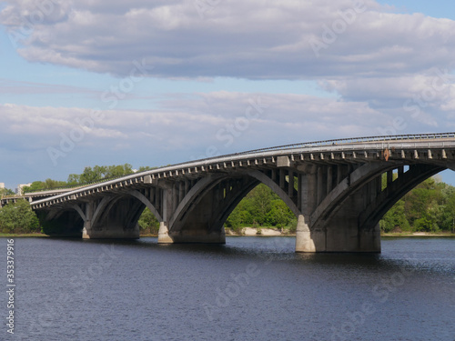View of the Dnieper river and metro bridge in a cloudy day, Kyiv, Ukraine.