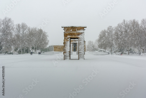view of the Egyptian temple of Debod in Madrid after a big snowstorm