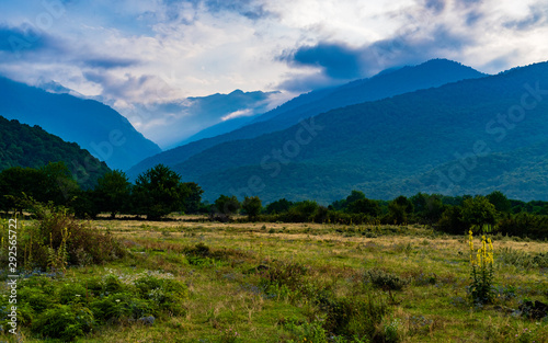 mountain, landscape, nature, mountain, sky, forest, green, blue, summer, grass, travel, vale, view, cloud, hill, panorama, tree, range, snow, cloud, hill, tree, peak, beautiful, scenery
