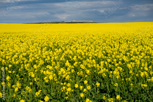 View of the medieval village of Uruena since yellow rape fields in bloom in the foreground