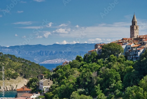 architecture, building, tower, europa, croatia, city, old, town, sky, travel, clock, stone, tour tourism, cloud, cloud, tree, tree, green, house, mountain, hill, view, roof, panorama, roof, city landscape, summer, sea, building, nature, landscape, house