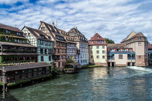 View of the river and Small houses in the European the city of Strasbourg