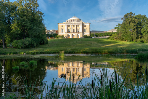 View of the Summer Palace of Emperor Paul I in Pavlovsk from the Slavyanka River, Saint Petersburg Russia