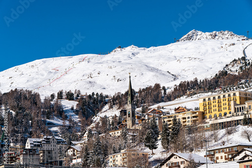 View of the town of St. Moritz during winter in the shade with snow covered mountains in background on a sunny day in Switzerland.