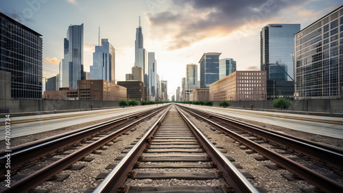 View of the train tracks leading into the skyscraper skyline