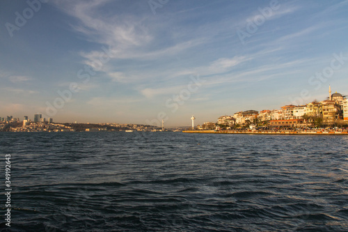 View of the Uskudar district of Istanbul from the Bosphorus at sunset. Turkey