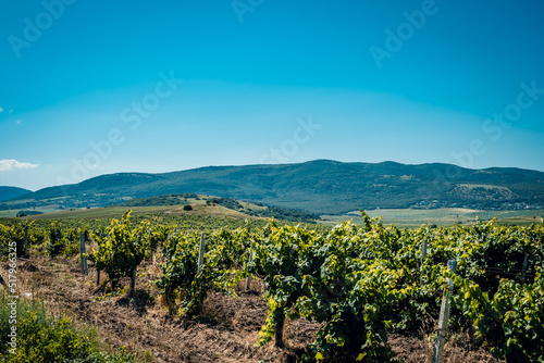 View of the vineyard in the evening at sunset in cloudy weather