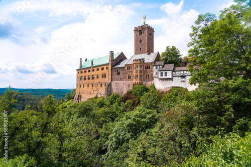 View of the Wartburg from outside and the Thuringer forest in the background, Eisenach, Germany