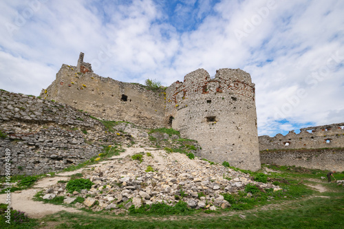 View of the weathered stone ruins of Plavecký hrad castle reach towards the sky under a canopy of scattered clouds, Plavecké Podhradie, Bratislava Region, Slovakia.