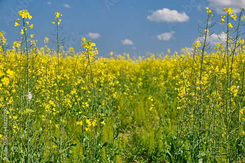 View of yellow Rape or Canola field between trees. Rapeseed (Brassica napus) oil seed rape. Focus on the foreground