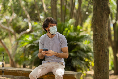 View of young man using a smartphone at day time with a green park in the background. High quality photo