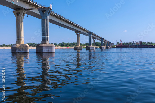 View on the famous dancing bridge in Volgograd from the water of Volga river in the hot clear sunny summer day