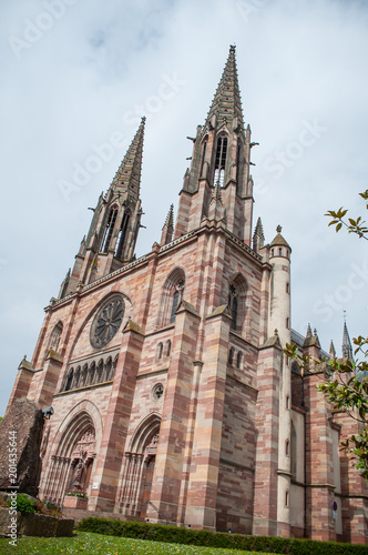 View on the saint Pierre cathedral in Obernai old town in Alsatian village, France