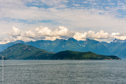 View over Inlet, ocean and island with mountains in beautiful British Columbia. Canada.