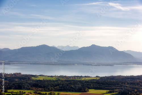 view over Lake Chiemsee to the Alps with clouds and blue sky