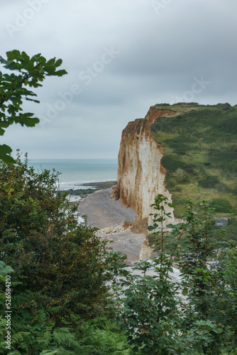 View through green trees down to the beach with big Cliff of Alabaster Coast, Plage des Petites Dalles, Normandy, France