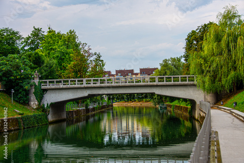 View to the bridge ove the river Ljubljanica in city of Ljubljana in Slovenia