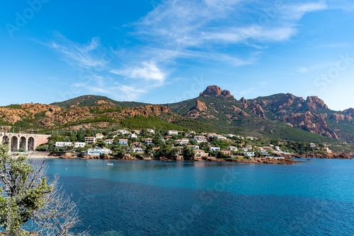 Views along Corniche d’Or or Corniche de l’Esterel beautiful coastal road, crystalline blue sea and sky combined with reddish color of Massif de l’Esterel mountains, travel destination in France