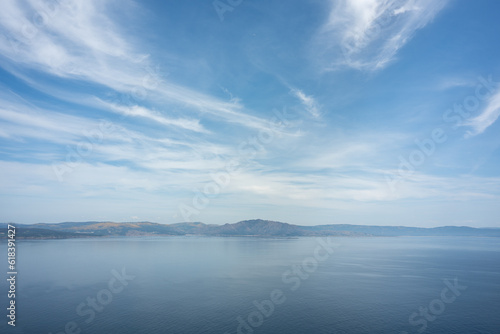 Views of the sea, the cloudy sky and the mountains in the background from Finisterre, the end of the Camino de Santiago pilgrimage.