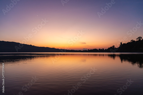 Views of the sunrise at Lake Beratan with boats on shore, Bali